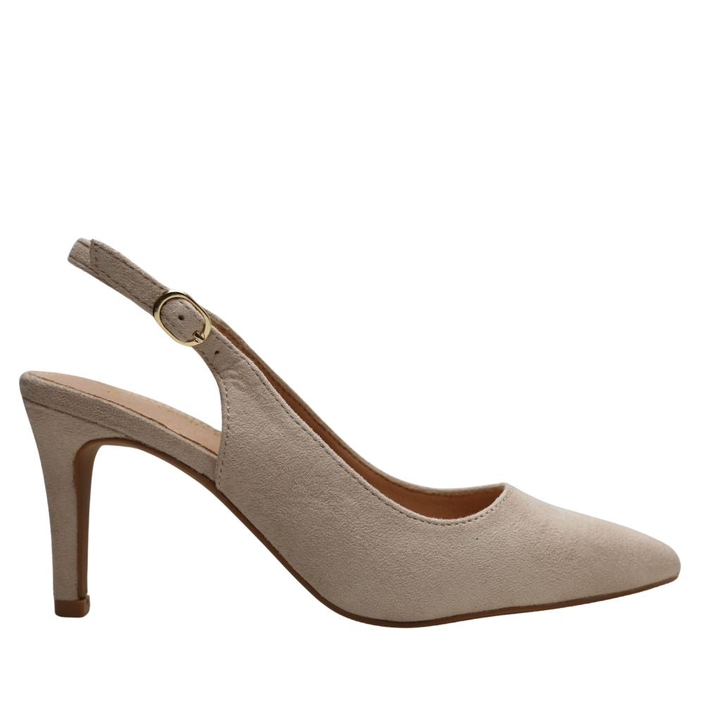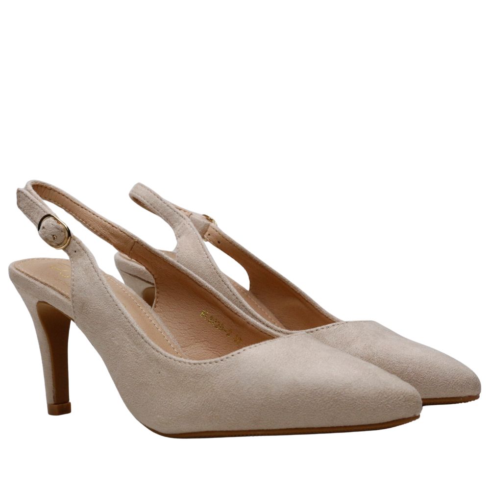 Zapato de salón para mujer en piel de antelina de color beige , suela flexible y antideslizante que ofrece una mayor estabilidad. Planta de piel con una espuma de alta calidad, que reduce la fatiga al caminar.