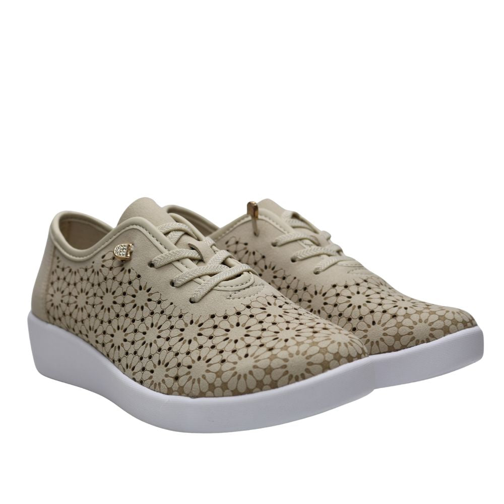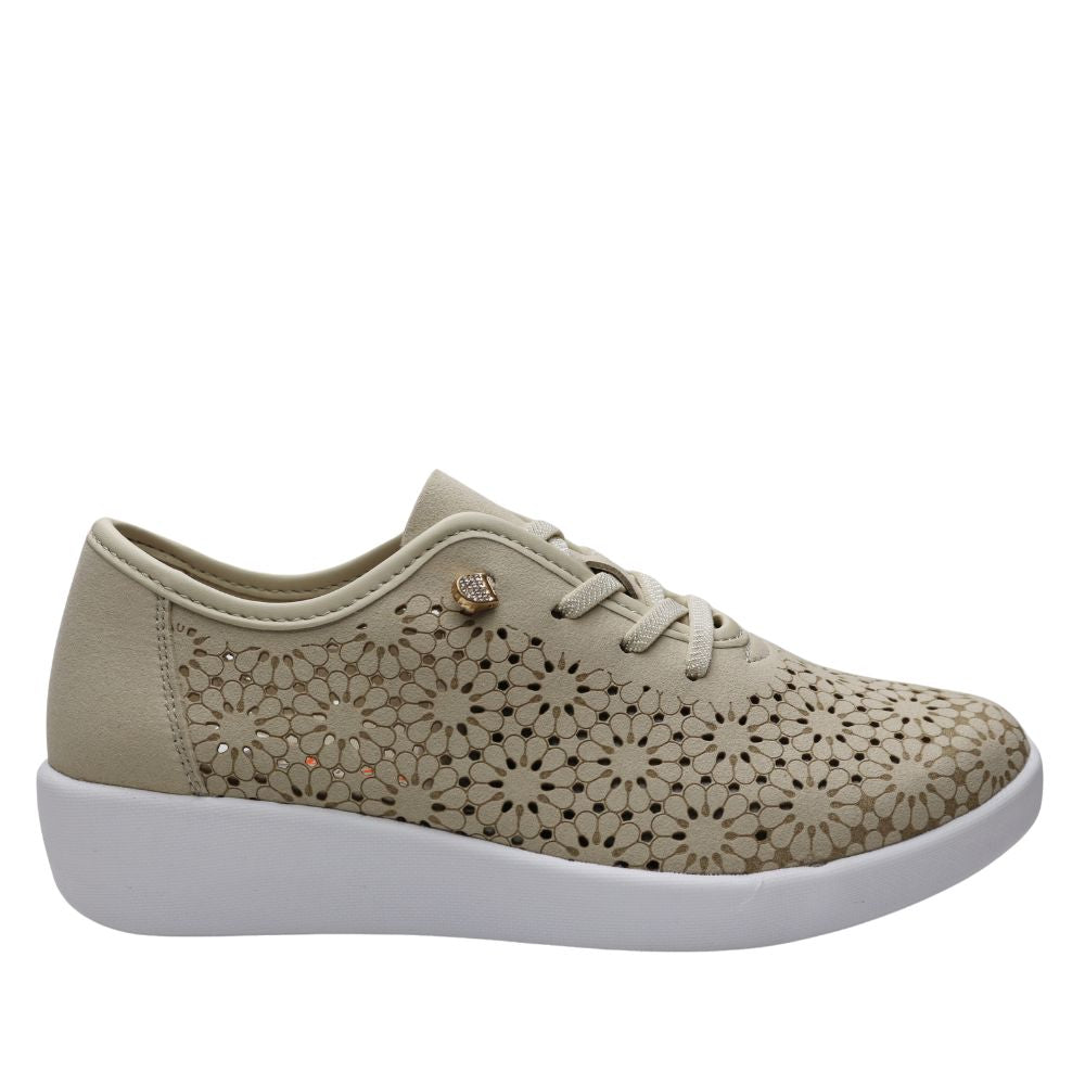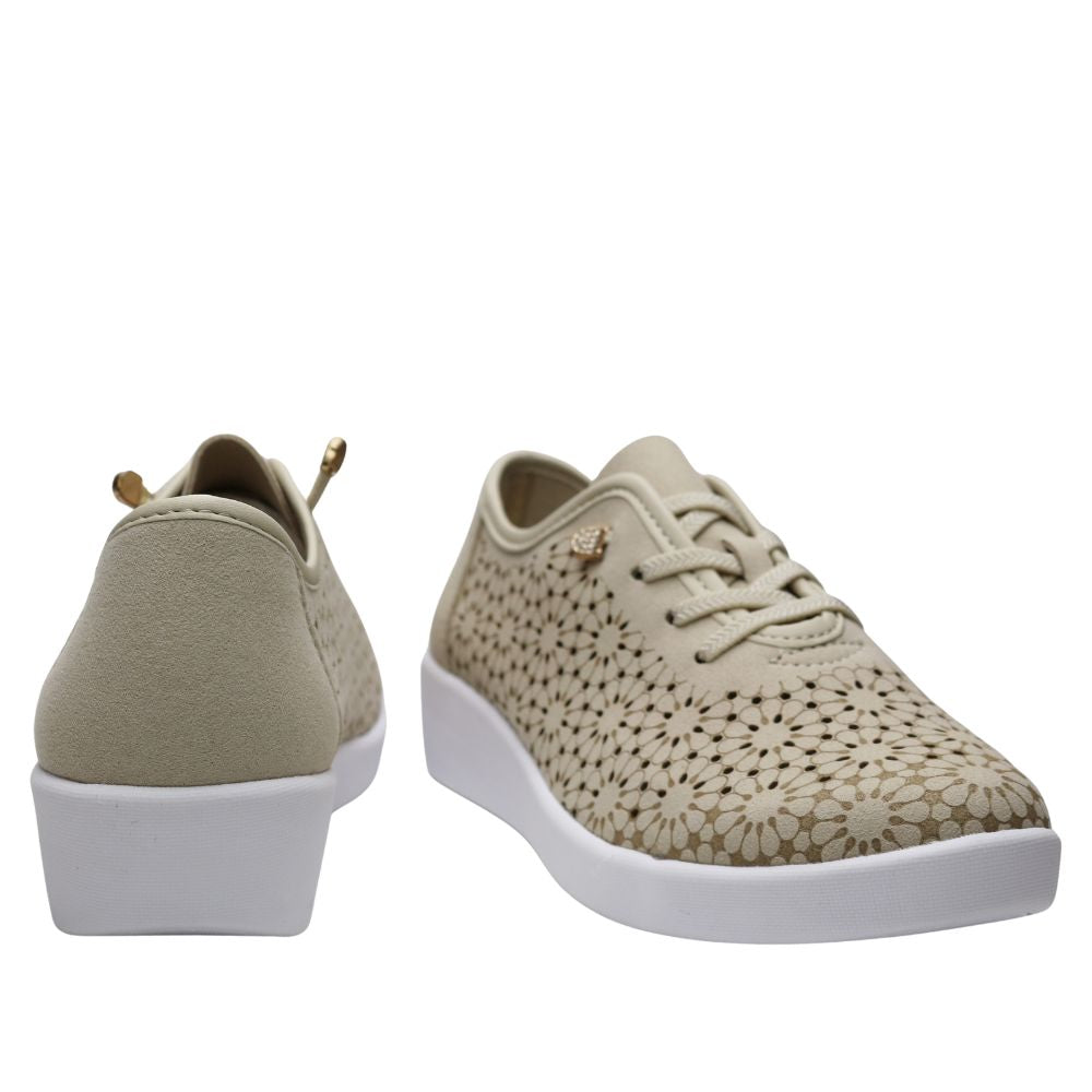 Deportivo de mujer tipo blucher con picados láser en color platino. Cuenta con cierre de cordones, plantilla extraíble Memory Foam y suela de goma súper ligera. El material picado favorece la transpiración del pie en los días más calurosos.