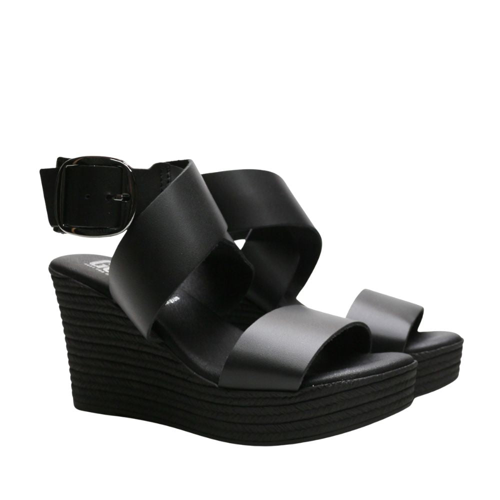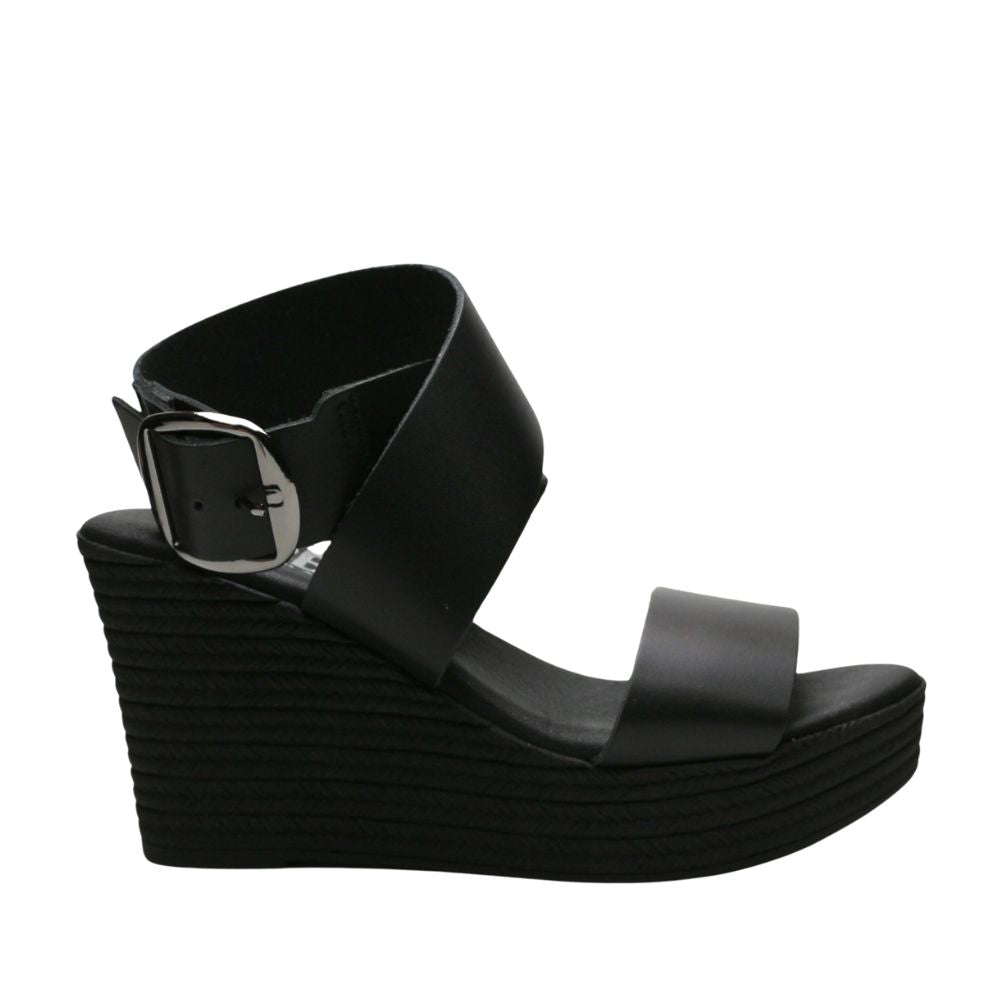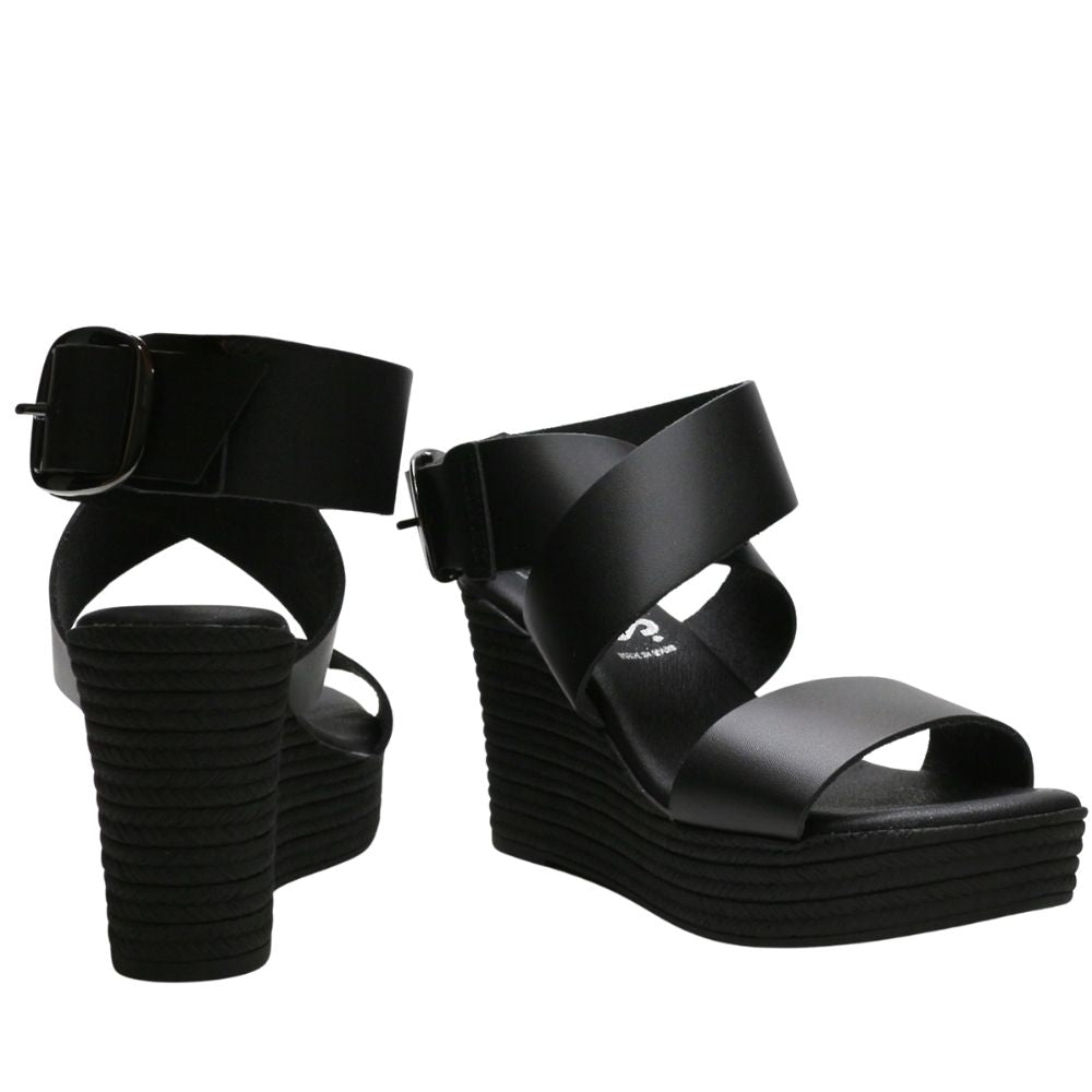 Sandalia para mujer en piel de color negra cogida al tobillo  con hebilla, cuña al tono imitando al esparto  de 10 cm y plataforma para mayor comodidad. Planta de gel que amortigua y aporta confort.