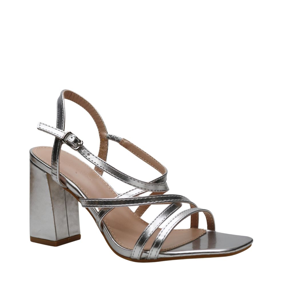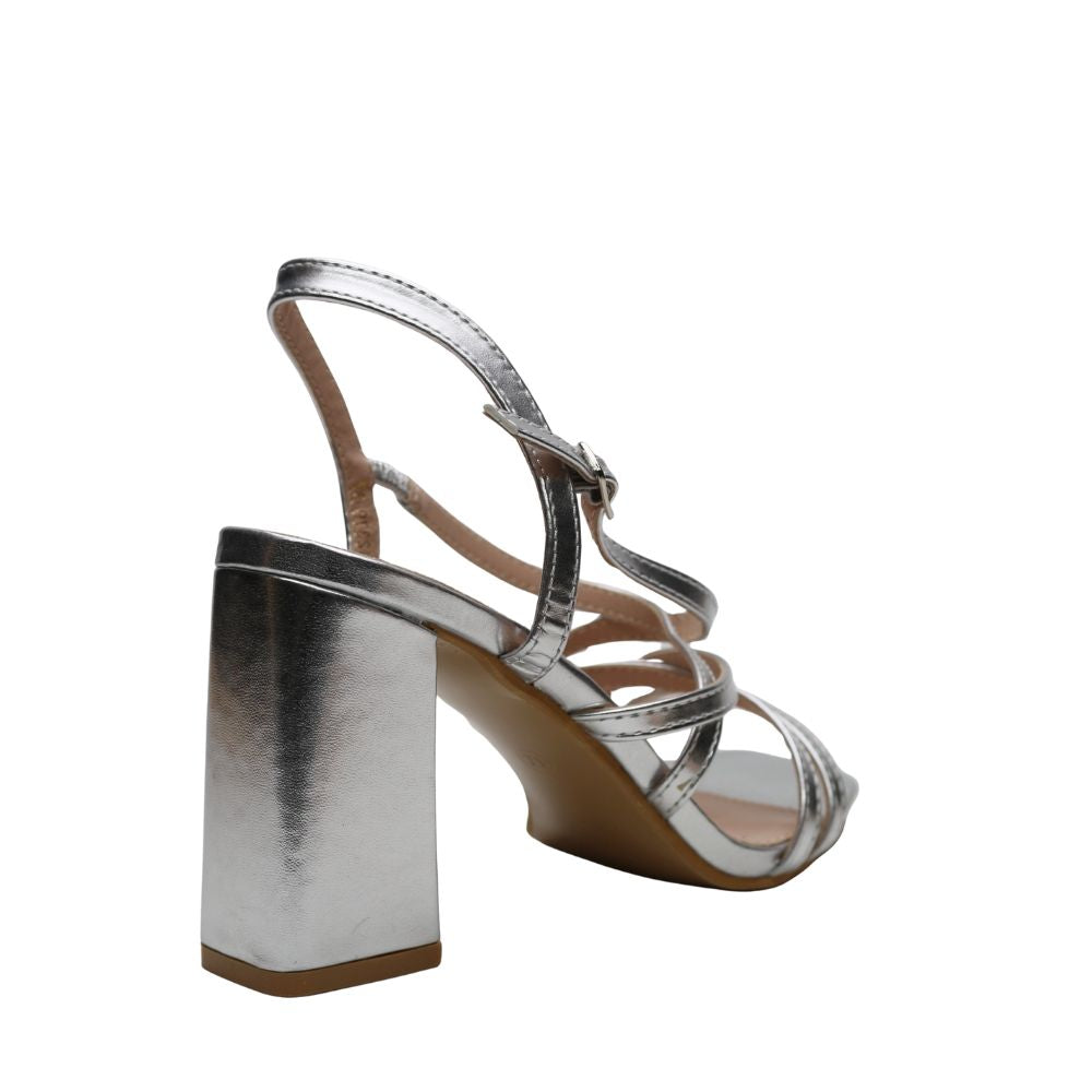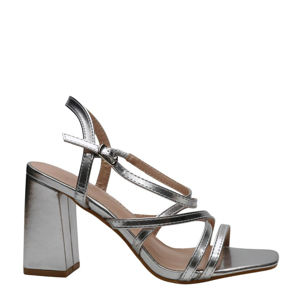 Sandalia plata para mujer con tiras cruzadas que realzan la pierna, tacón ancho de 9 cm y puntera descubierta.Cierre con hebilla regulable en el tobillo.