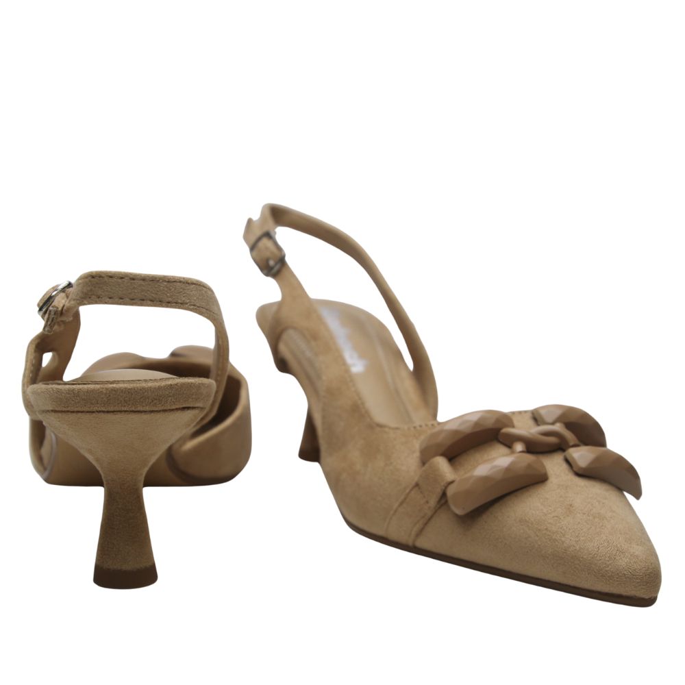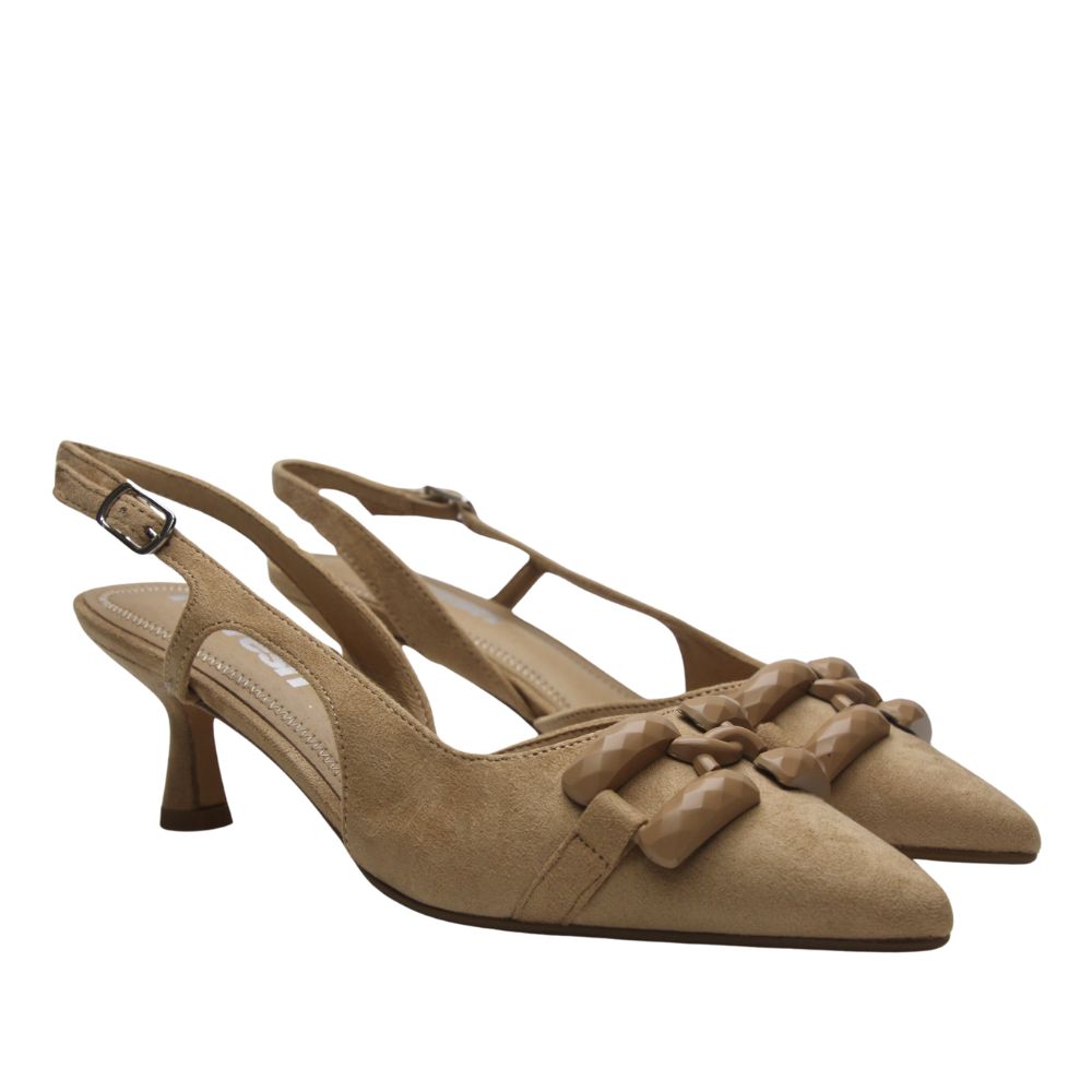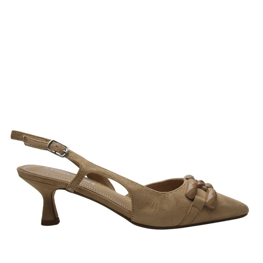 Zapato de salón  de mujer, de la marca Refresh. Fabricada en material de antelina que imita la piel de color beige con adorno de eslabón y cierre mediante hebilla. Tacón ancho de chupete de 6 cm . Suela antideslizante.